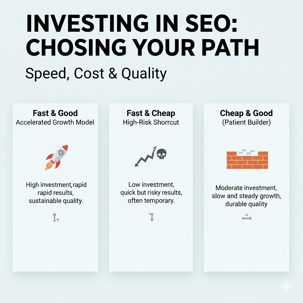 In business, there’s a classic framework known as the “Triple Constraint.” It suggests that you can have something fast, cheap, or high-quality—but you can only ever pick two. While this applies to everything from product manufacturing to interior design, it is especially true for SEO.